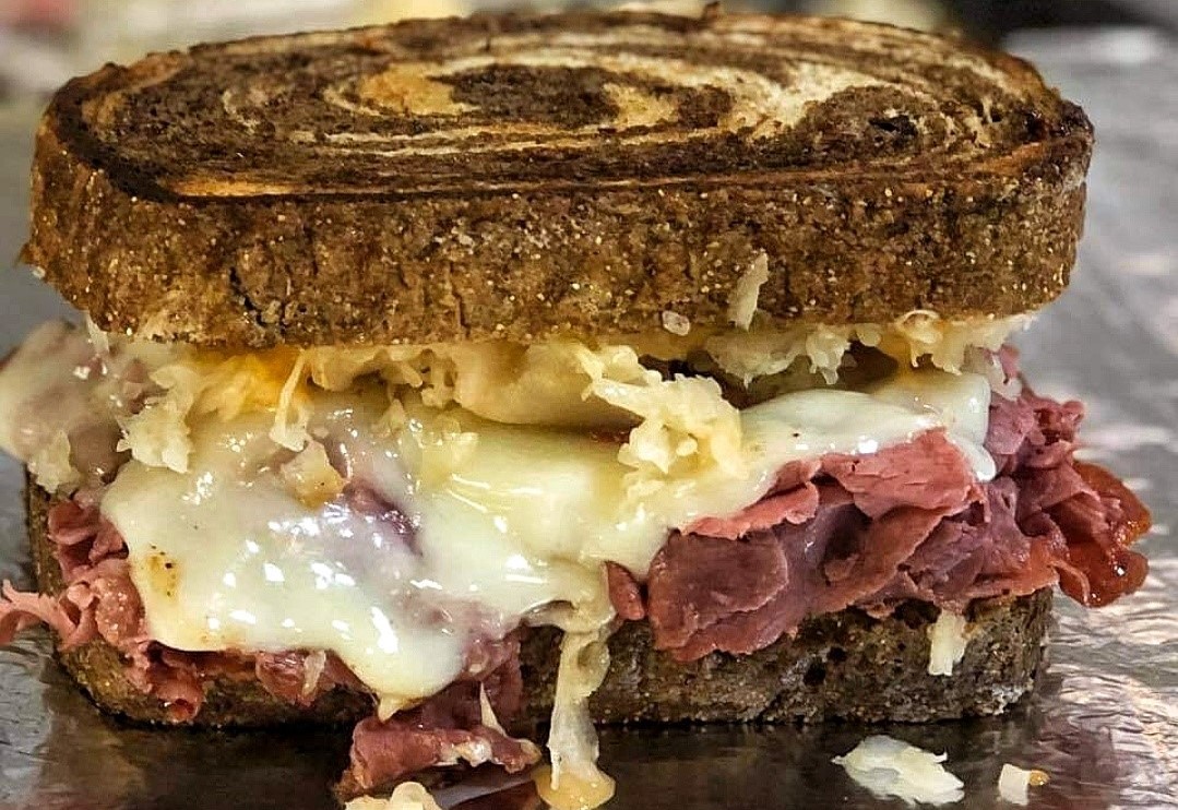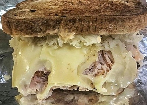 Layers of corned beef, Swiss cheese, Sauerkraut, and 1000 island dressing, on rye bread.