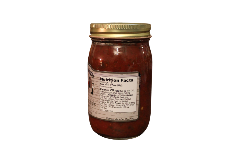 Ingredients: Crushed Tomatoes, onions, jalapeno peppers, water, sugar, vinegar, garlic, salt, spices