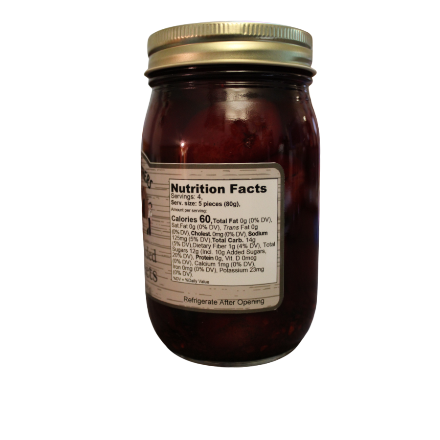 Ingredients: Beets, Pickling Liquid (sugar, water, beet juice, vinegar, natural flavor), Spices